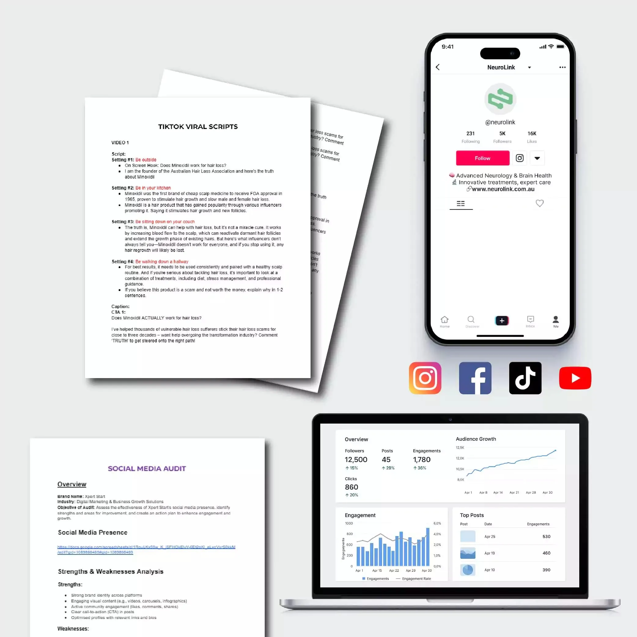 ✔ Onboarding Documents – A comprehensive form to align goals, brand voice, and objectives. ✔ 1-Hour Consultation – Kickstart your content strategy with a discovery session to refine tone, target audience, and campaign goals. ✔ Monthly Social Media Audit – Monthly deep dive into your profiles, analyzing content, trends, and user engagement for continuous improvement. ✔ Profile Optimization Checklist – Actionable improvements for bios, links, call-to-actions, and SEO best practices. ✔ 20 Viral TikTok/Reel Scripts (Monthly) – Each script includes: